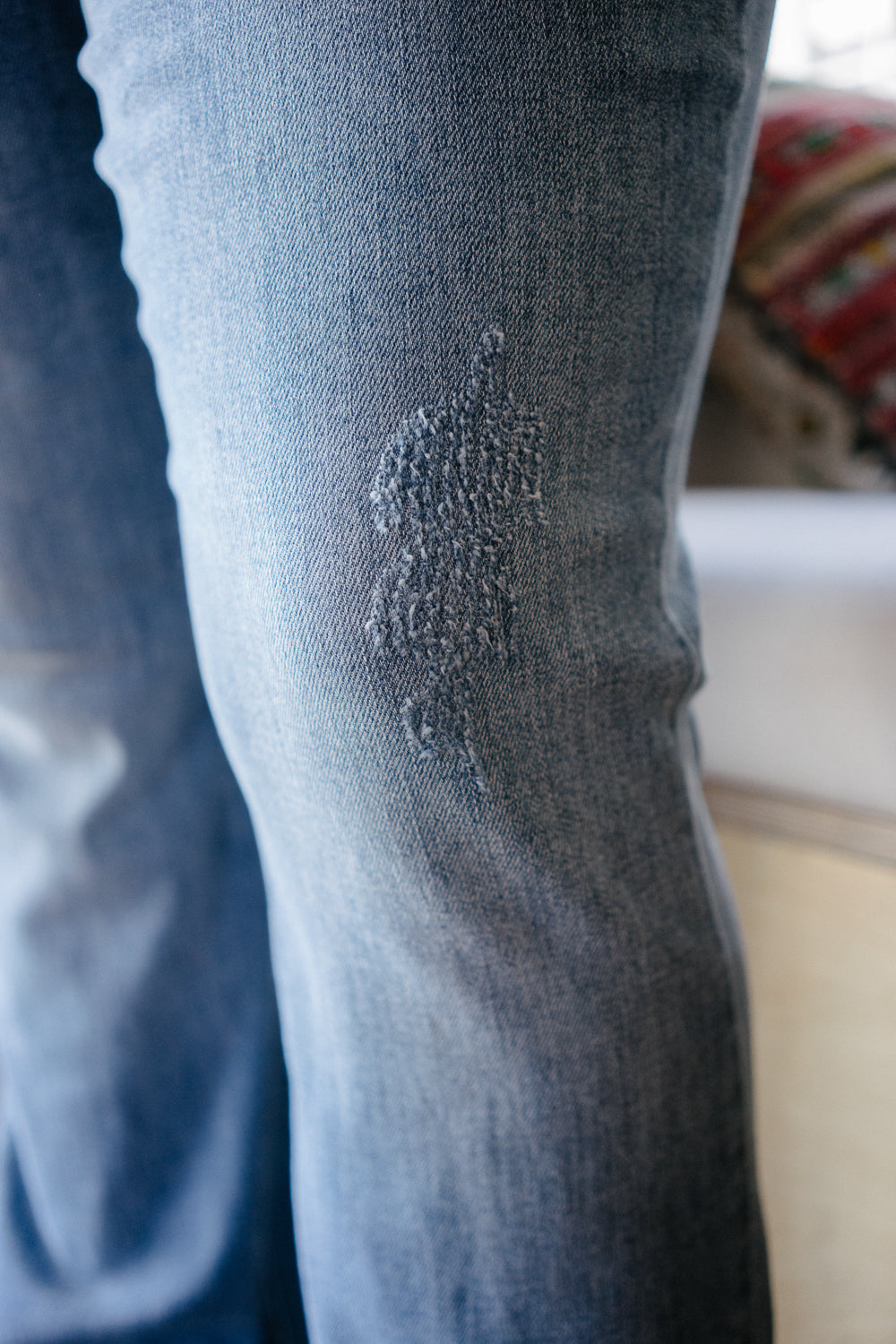 Initially, I liked these jeans but I ordered a size down and I think I could have gone two sizes down. They stretch out a lot during wear and run large to start with. Also, they are baggy in the crotch area. They just have a weird fit. And I didn’t realize they are distressed, which I don’t care for. In general, i just want to find a well fitting pair of mid rise jeans with a slight flair in different washes. Still searching.