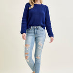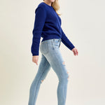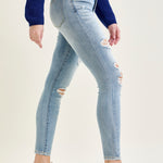 These distressed skinny jeans combine a flattering fit with a bold, edgy design that’s perfect for any occasion.