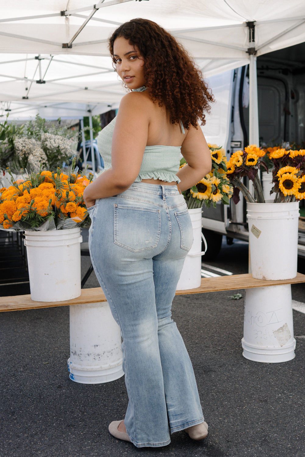 Megan Mid Rise Tinted Pin Tack Detail Flare Jeans - PLUS