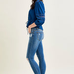 Add some edge to your wardrobe with these skinny jeans featuring a bold destroy hem and a flattering fit that moves with you.