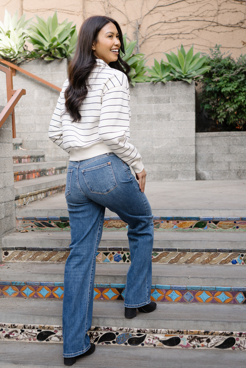 These jeans feature a unique V-front waistband with a mid-rise front and high-waisted back for a flattering, sculpted fit. The classic straight-leg cut and vintage wash make them a versatile staple with just the right amount of stretch.