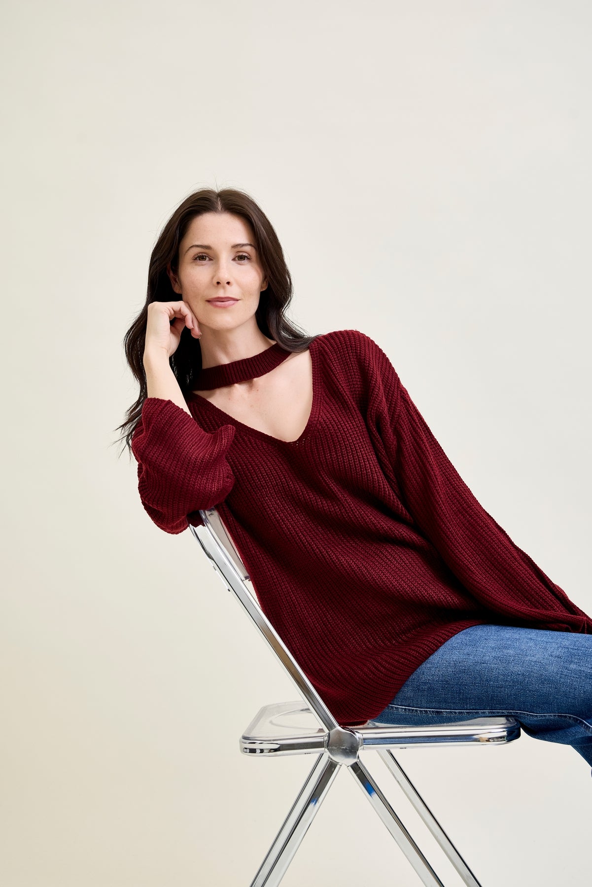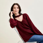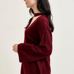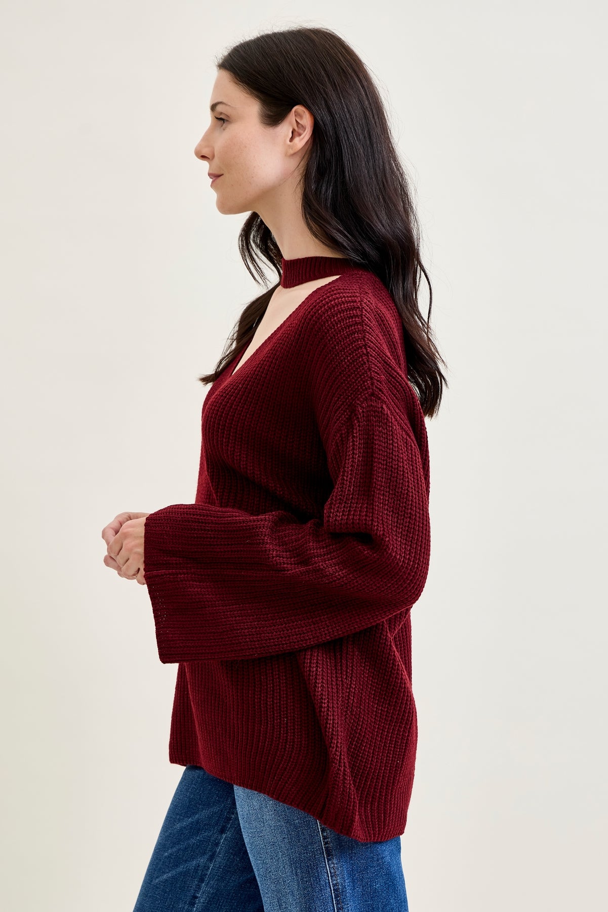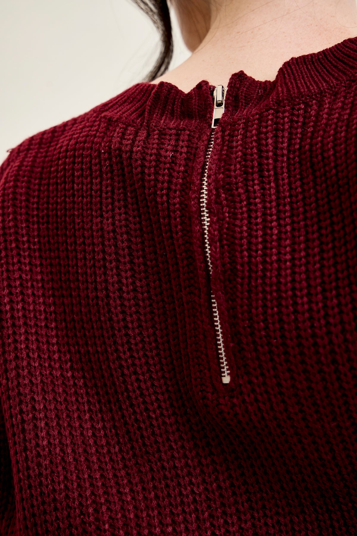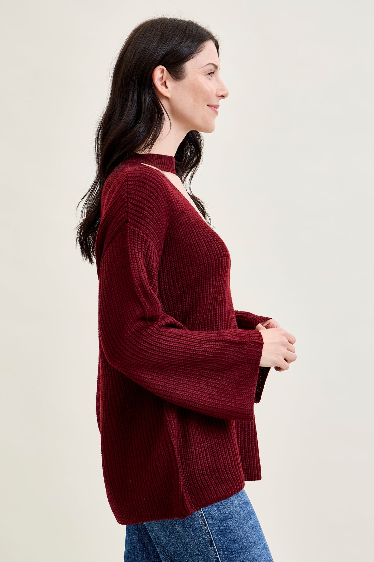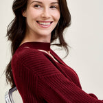 Bring bold color and modern style into your wardrobe with this rich burgundy cut-out pullover.