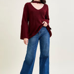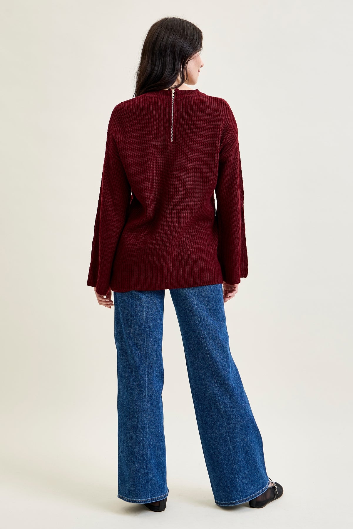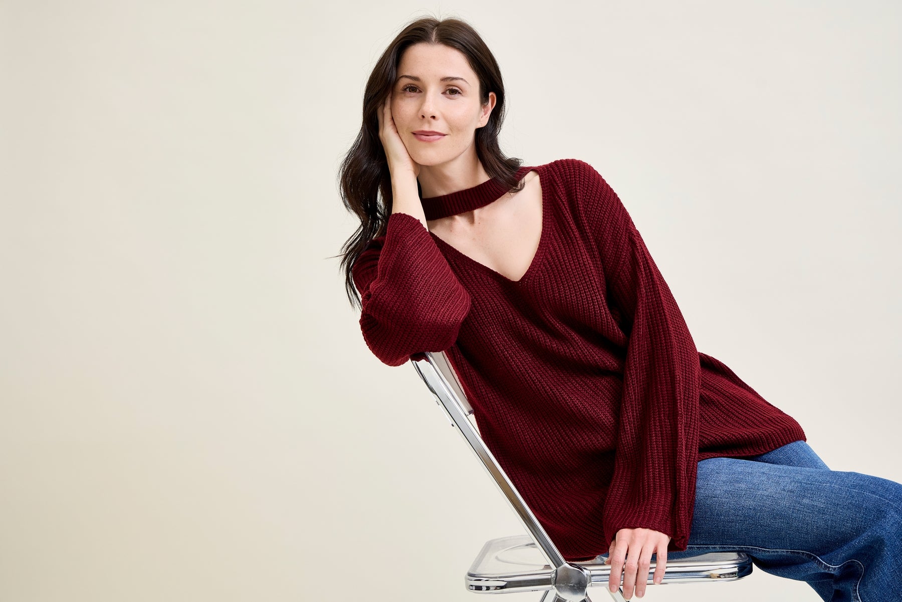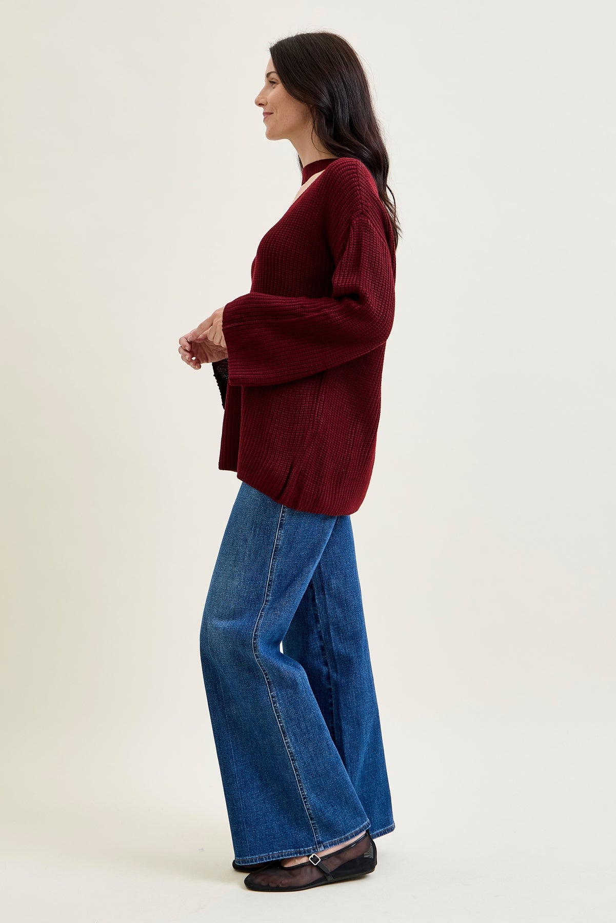 Bring bold color and modern style into your wardrobe with this rich burgundy cut-out pullover.