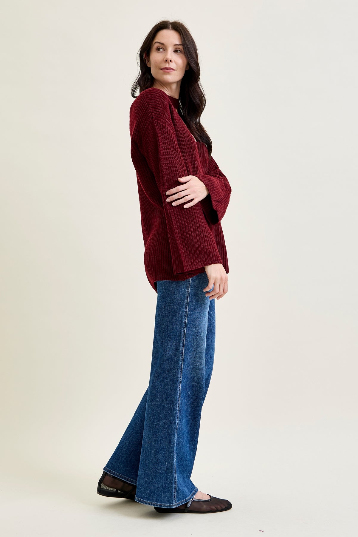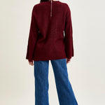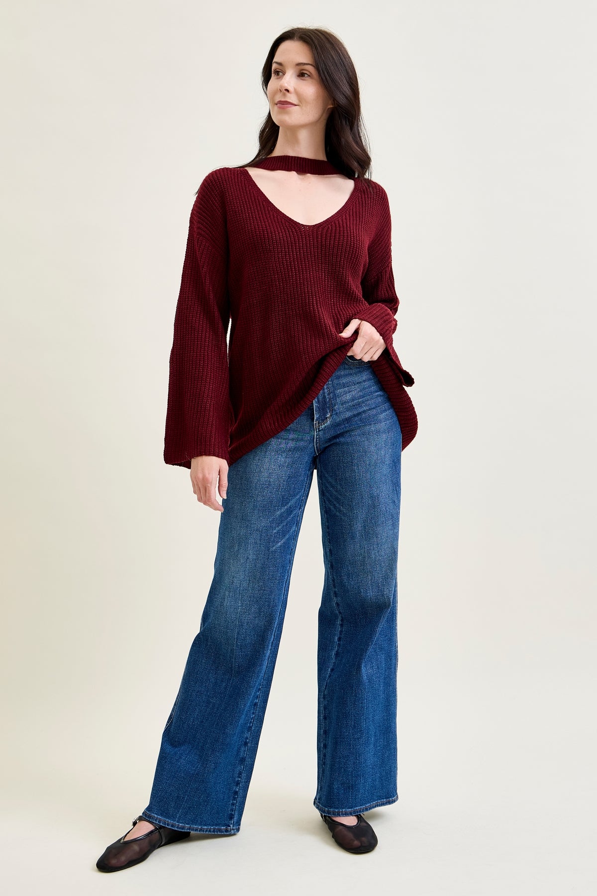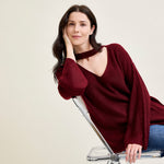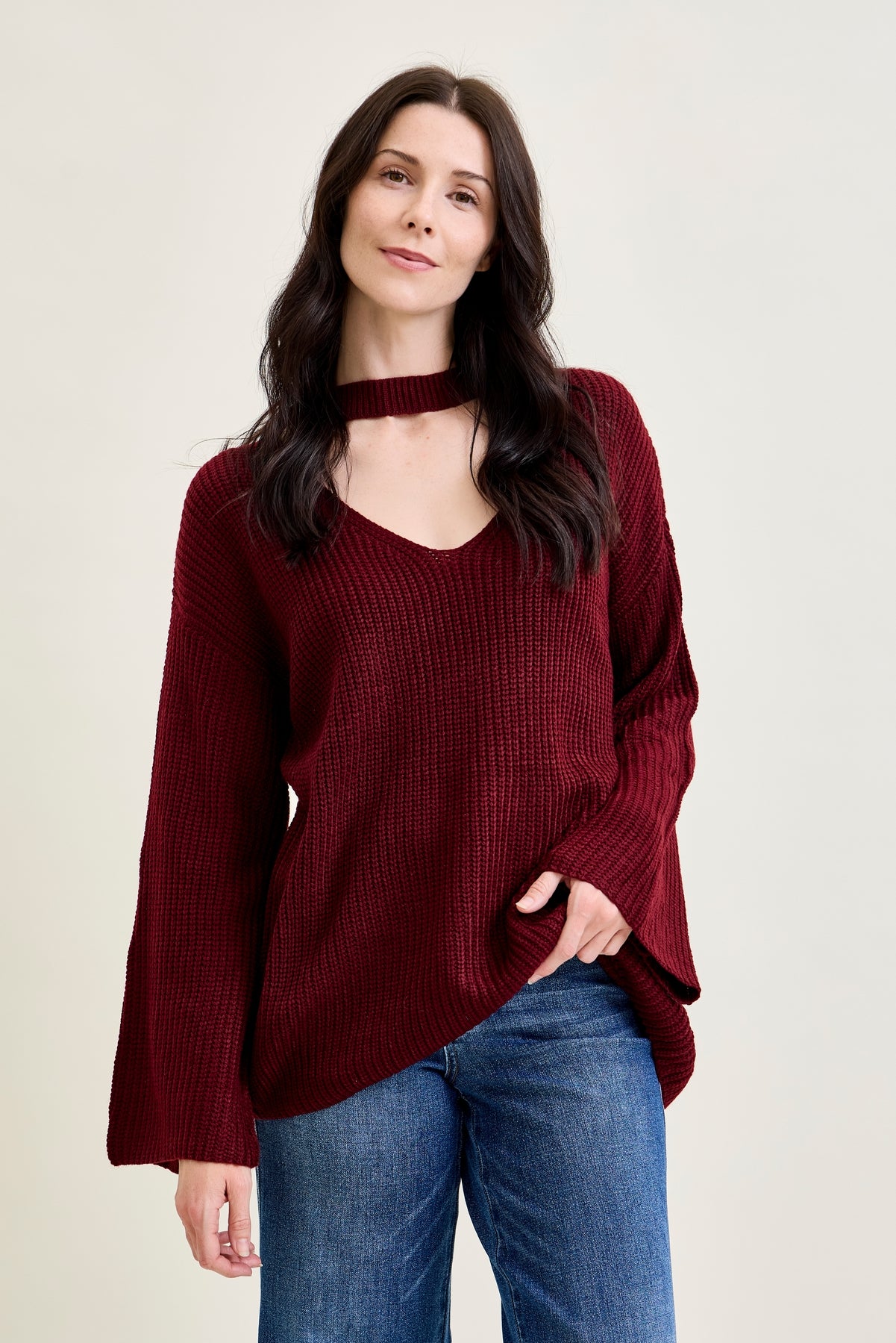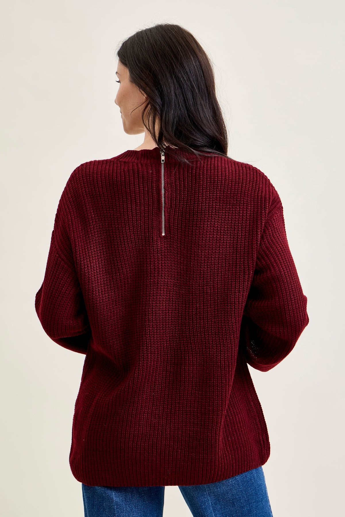 Bring bold color and modern style into your wardrobe with this rich burgundy cut-out pullover.