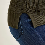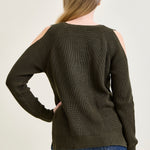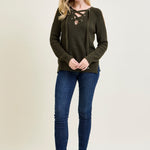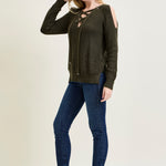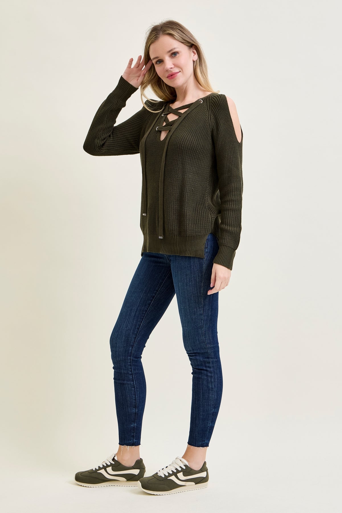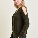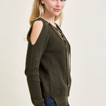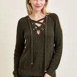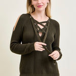 V-Neck Lace-Up Cold Shoulder Green Sweater
